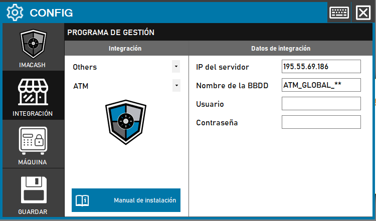 - IP del servidor: Introduce la dirección IP del servidor donde está instalada la base de datos de ATM Hospital (ejemplo: 195.55.69.186)