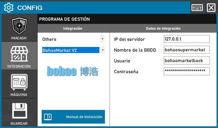 - IP del servidor: Introduce la dirección IP del servidor donde está instalado Bohao Market V2 (ejemplo: 127.0.0.1)