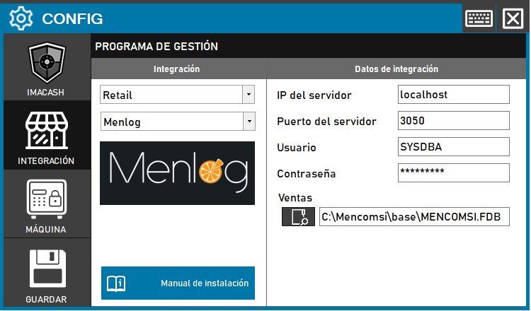 Para integrar Software Menlog con ImaCash, el técnico deberá ingresar la localización del fichero de la base de datos (que es un archivo FireBird llamado MENCOMSI.FDB) y las