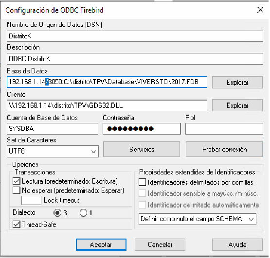 - Base de Datos: Ruta completa al archivo .FDB (ejemplo:192.168.1.14/3050:C:\distritoK\TPV\Database\VIVERSTO\2017.FDB)