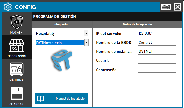 - IP del servidor: Introduce la dirección IP del servidor donde está instalado DST Hostelería (ejemplo: 127.0.0.1 para servidor local)