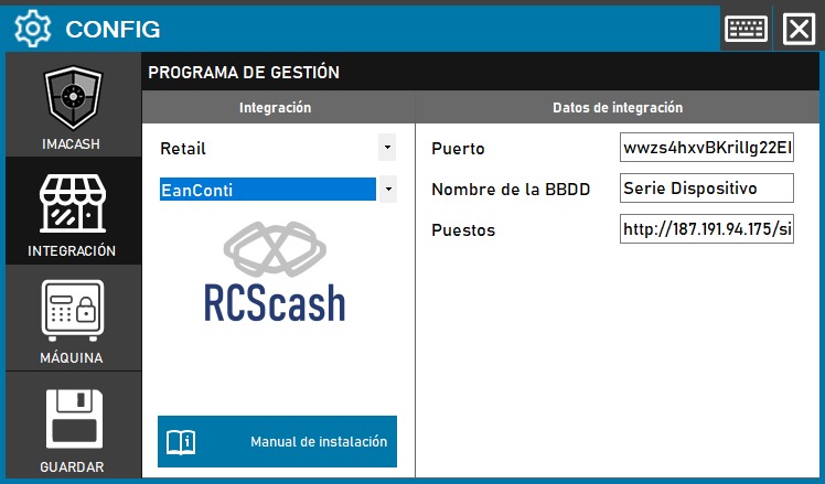 Para integrar EANCONTI con ImaCash, el técnico deberá configurar los datos de conexión del sistema RCSCash.