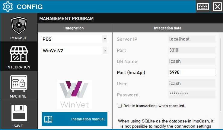 Para integrar Software WinVetV2 con ImaCash, el técnico deberá rellenar los datos de conexión a la base de datos MySQL (IP, Puerto, BBDD, Usuario y Contraseña) y especificar el Puerto (ImaApi). Esta integración permite además la opción de eliminar automáticamente las transacciones si estas son canceladas.