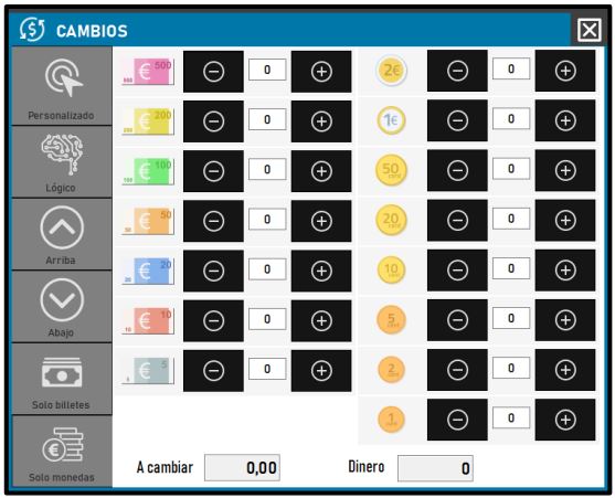 • Cambios: Permite realizar cambios de efectivo de manera automática, y existen varias opciones de cambio según la necesidad: