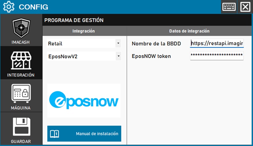Para integrar el Software EposNow V2 con ImaCash, el técnico deberá configurar los Webhooks en la Backoffice de EposNow, indicando la BaseURL y las claves de autenticación. En ImaCash, se debe rellenar el Nombre de la BBDD (que es la URL de la REST API) y el EposNow token.