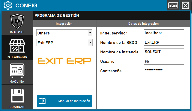 Para integrar Software Exit ERP con ImaCash, el técnico deberá especificar la dirección IP del servidor donde está instalada la base de datos de Exit ERP, ya que el resto de datos de conexión suelen ser preestablecidos.