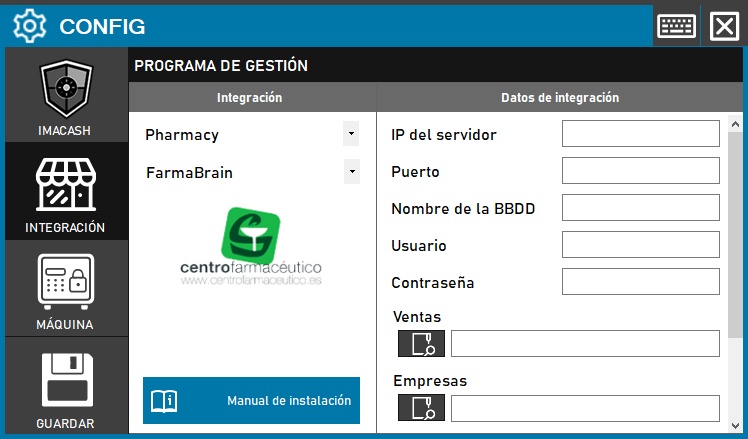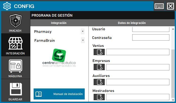 Para integrar el Software FarmaBrain con ImaCash, el técnico deberá ingresar los datos completos de conexión a la base de datos (IP, Puerto, BBDD, Usuario y Contraseña) y, además, especificar las rutas de varios ficheros que contienen información de ventas y gestión.