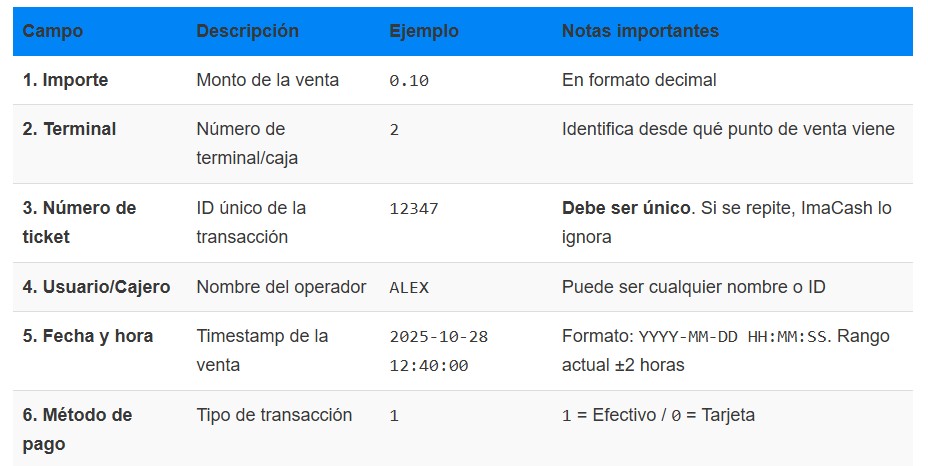 - Número de ticket único – Si repites un número, ImaCash asume que es un duplicado y no lo procesa