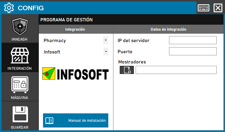 Para integrar el Software InfoSoft con ImaCash, el técnico deberá ingresar la dirección IP del servidor y el puerto de conexión, además de especificar la ruta completa del directorio de Mostradores.