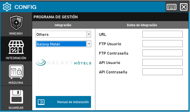Para integrar el Software Galaxy Hotel con ImaCash, el técnico deberá obtener y rellenar la URL y las credenciales de conexión tanto para el FTP como para la API, las cuales serán facilitadas por Galaxy Hotel.