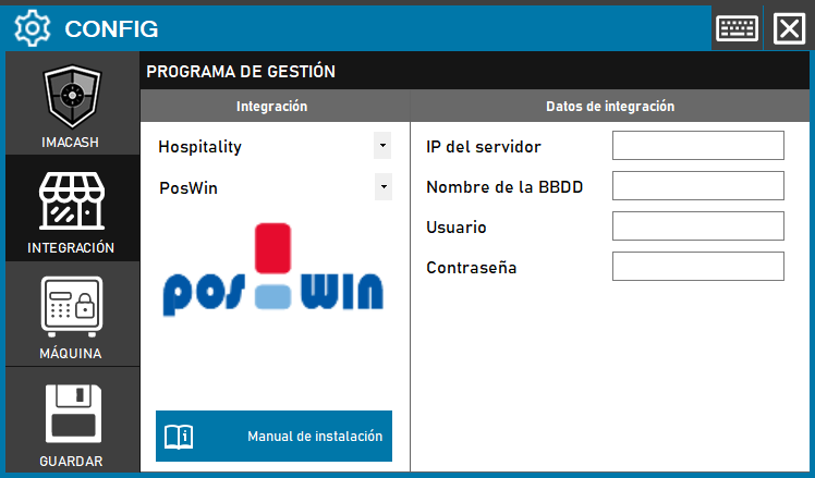 Para integrar el Software PosWin con ImaCash, el técnico deberá configurar los parámetros de conexión al servidor donde se encuentre instalado el programa de gestión. Es necesario introducir la IP del servidor, el Nombre de la BBDD y las credenciales correspondientes.