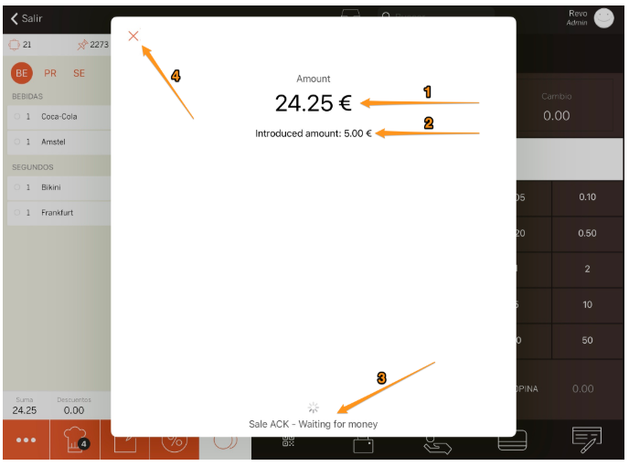 Para cobrar una orden con la máquina de efectivo de ImaCash solo hay que pulsar el icono de cobrar en efectivo. A partir de este momento, Revo XEF se conectará con la máquina de efectivo para gestionar el cobro y cuando haya efectuado la transacción, Revo XEF cerrará la orden.