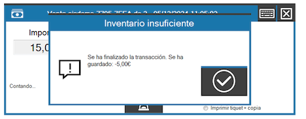 En todos los casos, ImaCash a través de su pantalla informará de que el inventario es insuficiente, deberemos pulsar en conforme somos conscientes que no hay cambio y automáticamente, ImaCash procesará la transacción y en REVO se finalizará la venta.