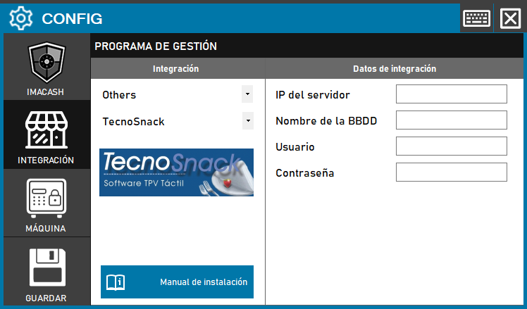 - Accede al menú CONFIG > INTEGRACIÓN en la interfaz de ImaCash.