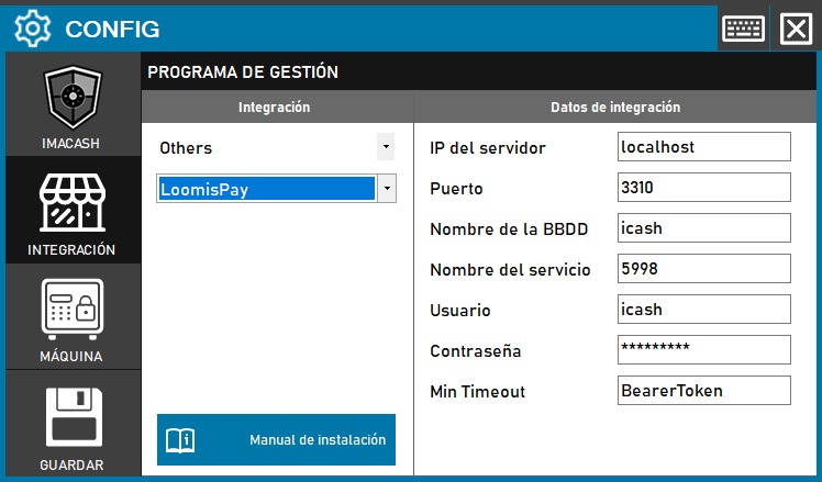 Para integrar Software LoomisPay con ImaCash, el técnico deberá rellenar los datos de conexión a la base de datos (IP del servidor, Puerto, Nombre de la BBDD, Usuario y Contraseña) y el BearerToken, además de configurar el Nombre del servicio y el campo Min Timeout.