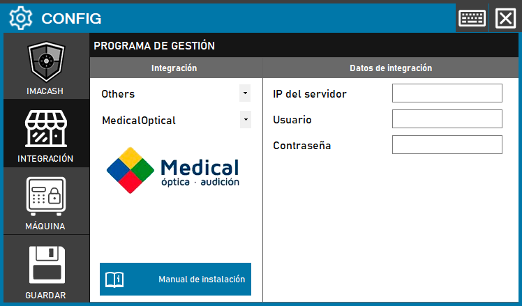 Para integrar el Software Medical (Medical Óptica/Audición) con ImaCash, el técnico deberá rellenar la IP del servidor, el Usuario y la Contraseña de la base de datos.