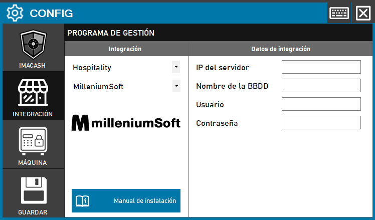 Para integrar Software Millenium Soft con ImaCash, el técnico deberá ingresar la IP del servidor, el Nombre de la BBDD, el Usuario y la Contraseña de la base de datos, ya que los técnicos de Millenium Soft deben dar acceso a la BBDD con estas credenciales.El técnico de Millenium Soft, deberá darnos acceso a la BBDD con su respectivo “usuario”y “contraseña”.