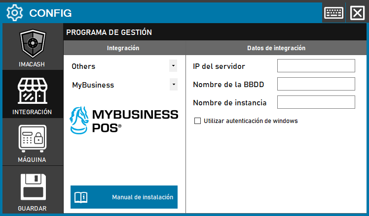 Para integrar el Software MyBusinessPOS con ImaCash, el técnico deberá rellenar la IP del servidor, el Nombre de la BBDD y el Nombre de instancia.