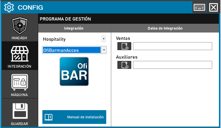 Para integrar Ofibarman Acces con ImaCash, el técnico deberá seleccionar la ruta completa de dos archivos Access (*.mdb) que contienen los datos de Ventas y Auxiliares.