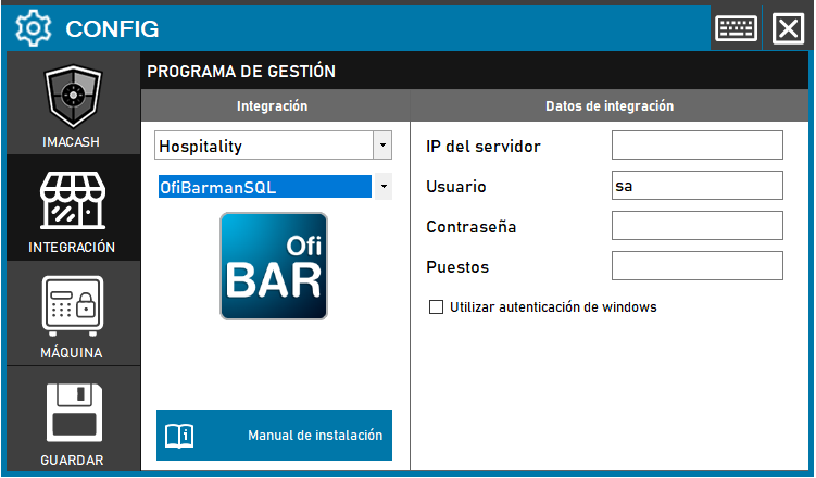 Para integrar Ofibarman SQL con ImaCash, el técnico deberá rellenar la IP del servidor, la Contraseña y el número de Puestos (que es el número de la empresa que se está utilizando). El Usuario suele ser predeterminado (sa).