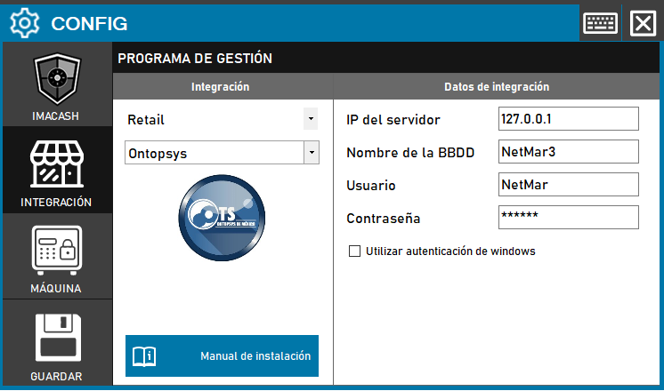Para integrar Software Ontopsys con ImaCash, el técnico deberá rellenar los datos de conexión a la base de datos, incluyendo la IP del servidor, el Nombre de la BBDD, el Usuario y la Contraseña. Esta integración también permite habilitar la autenticación de Windows si la infraestructura del cliente lo requiere.