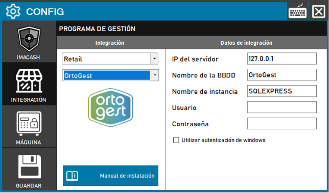 Para integrar Software Ortogest con ImaCash, el técnico deberá especificar la IP del servidor, el Usuario y la Contraseña de la base de datos. En caso de desconocer las credenciales, se debe crear un login de conexión o emplear la autenticación de Windows.