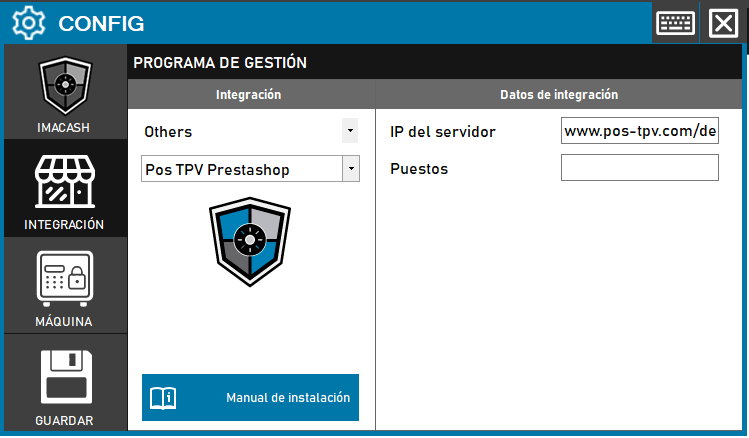 Para integrar el Software Pos TPV Prestashop con ImaCash, el técnico deberá introducir la URL del servidor (IP del servidor) donde se aloja la tienda o el servicio, asÃ? como especificar el nombre o identificador del Puesto de venta correspondiente.