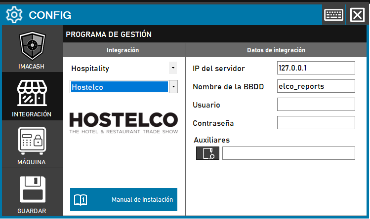 Para integrar el Software Hostelco con ImaCash, el técnico deberá rellenar la IP del servidor y las credenciales de la BBDD, además de seleccionar la ruta del archivo de usuarios (fichero de Auxiliares), que debe ser proporcionado por Hostelco.