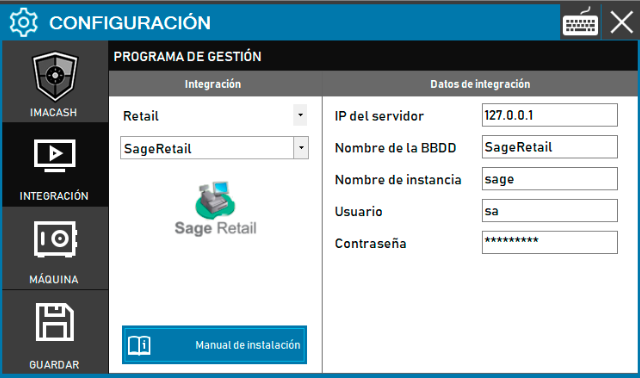 Para integrar el Software Sage Retail con ImaCash, el técnico deberá configurar los parámetros de conexión al servidor donde se aloja la base de datos del programa de gestión. La mayoría de los campos cuentan con valores predeterminados que pueden ser editados según las necesidades de la instalación del cliente.