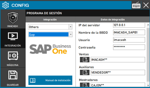 - Acceda al menú CONFIG → INTEGRACIÓN en la interfaz de ImaCash.
