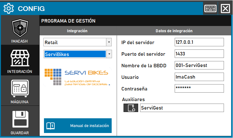 Para integrar el Software ServiBikes con ImaCash, el técnico deberá configurar los parámetros de conexión al servidor de la base de datos. Aunque el sistema ofrece valores predeterminados, estos pueden ser editados para ajustarse a la instalación específica del cliente.