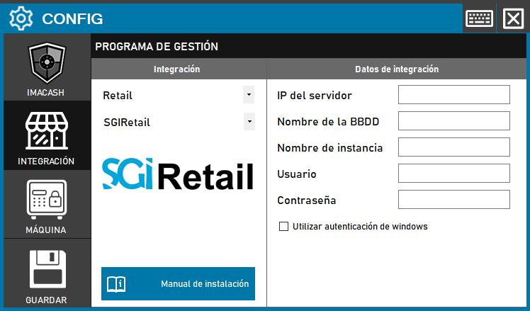 Para integrar el Software SGI Retail con ImaCash, el técnico deberá configurar los parámetros de conexión al servidor donde se aloja la base de datos del programa de gestión.