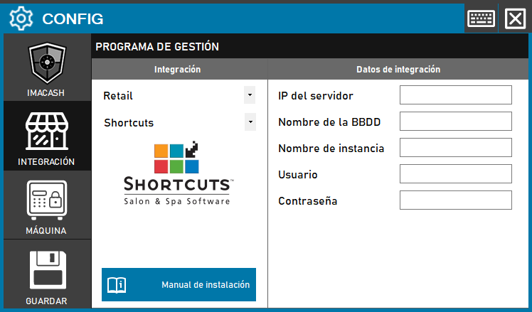Para integrar el software Shortcuts (Salon & Spa Software) con ImaCash, el técnico debe configurar el acceso a la base de datos SQL para permitir la comunicación entre el sistema de gestión del centro y el terminal de efectivo.