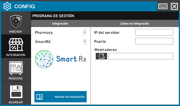 Para integrar el Software Smart RX con ImaCash, el técnico deberá configurar los parámetros de red y la ubicación de los archivos de terminales necesarios para la comunicación.