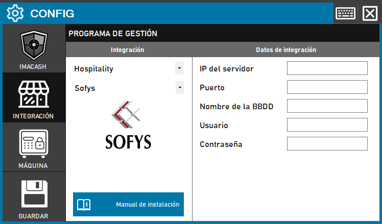 Para integrar el Software Sofys con ImaCash, el técnico deberá configurar los parámetros de conexión al servidor y la base de datos donde está instalado el programa.