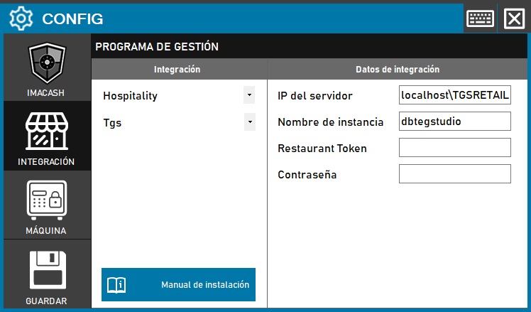 - Acceda al menú CONFIG → INTEGRACIÓN en la interfaz lateral de ImaCash.