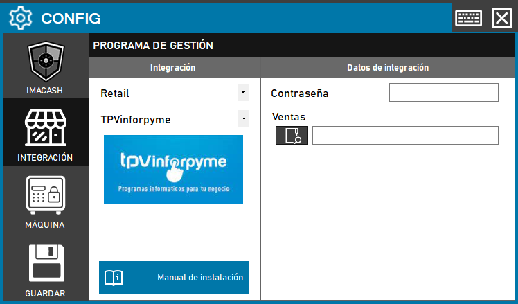 - Accede al menú CONFIG → INTEGRACIÓN en la interfaz de ImaCash.